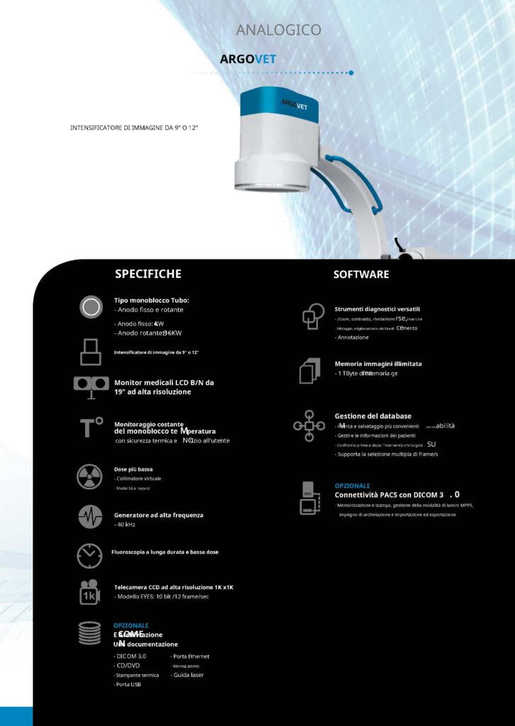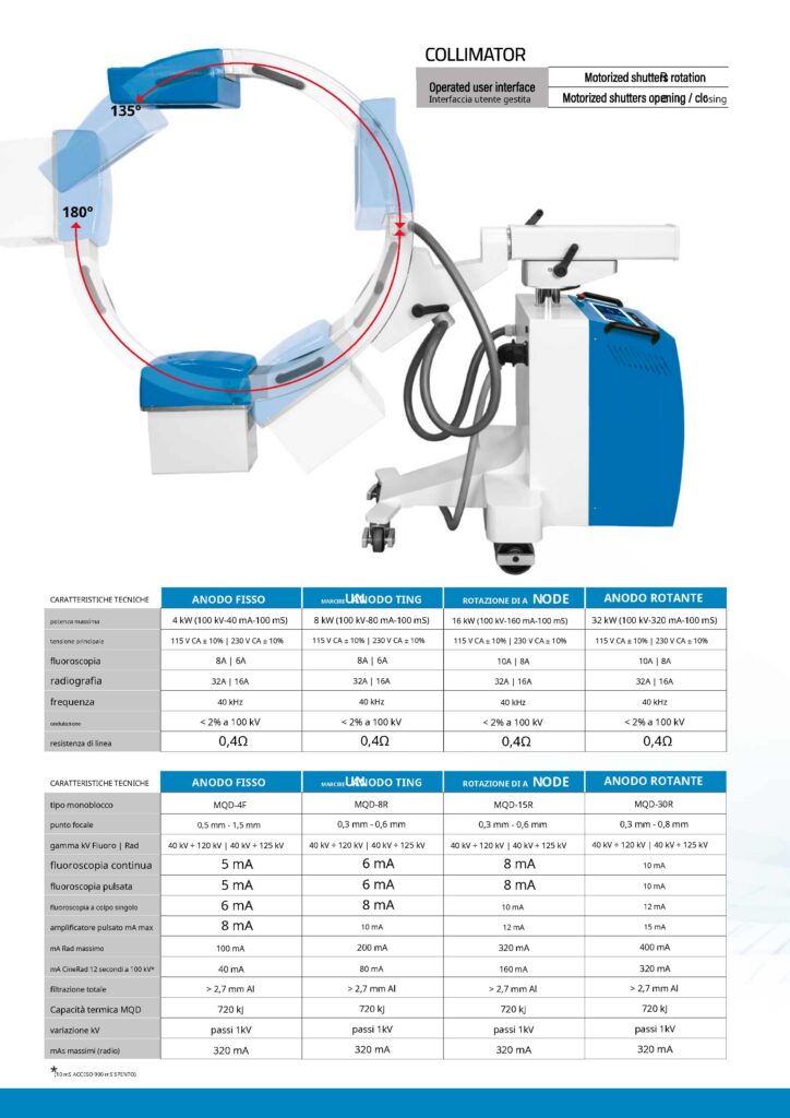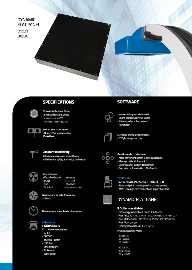 Strumenti diagnostici versatili – Zoom, contrasto, rivelazione – Filtraggio, miglioramento dei bordi – Annotazione rse, ce invertire mento – Anodo fisso: KW – Anodo rotante:16KW Intensificatore di immagine da 9″ o 12″ Memoria immagini illimitata – 1 TByte dmi maemoria ge Monitor medicali LCD B/N da 19″ ad alta risoluzione Gestione del database Monitoraggio costante del monoblocco te – ricerca e salvataggio più convenienti – Gestire le informazioni dei pazienti – Confronto prima e dopo l’intervento chirurgico – Supporta la selezione multipla di frame/s M berrettoabilità Mperatura con sicurezza termica e NOtizio all’utente SU Dose più bassa – Collimatore virtuale – Modalità a impulsi OPZIONALE Connettività PACS con DICOM 3 . 0 – Memorizzazione e stampa, gestione della modalità di lavoro MPPS, Generatore ad alta frequenza impegno di archiviazione e importazione ed esportazione – 40 kHz Fluoroscopia a lunga durata e bassa dose Telecamera CCD ad alta risoluzione 1K x1K 1k – Modello EYES: 10 bit /12 frame/sec OPZIONALE E Archiviazione Una documentazione COME N – DIC OM 3.0 – CD/DVD – Stampante termica